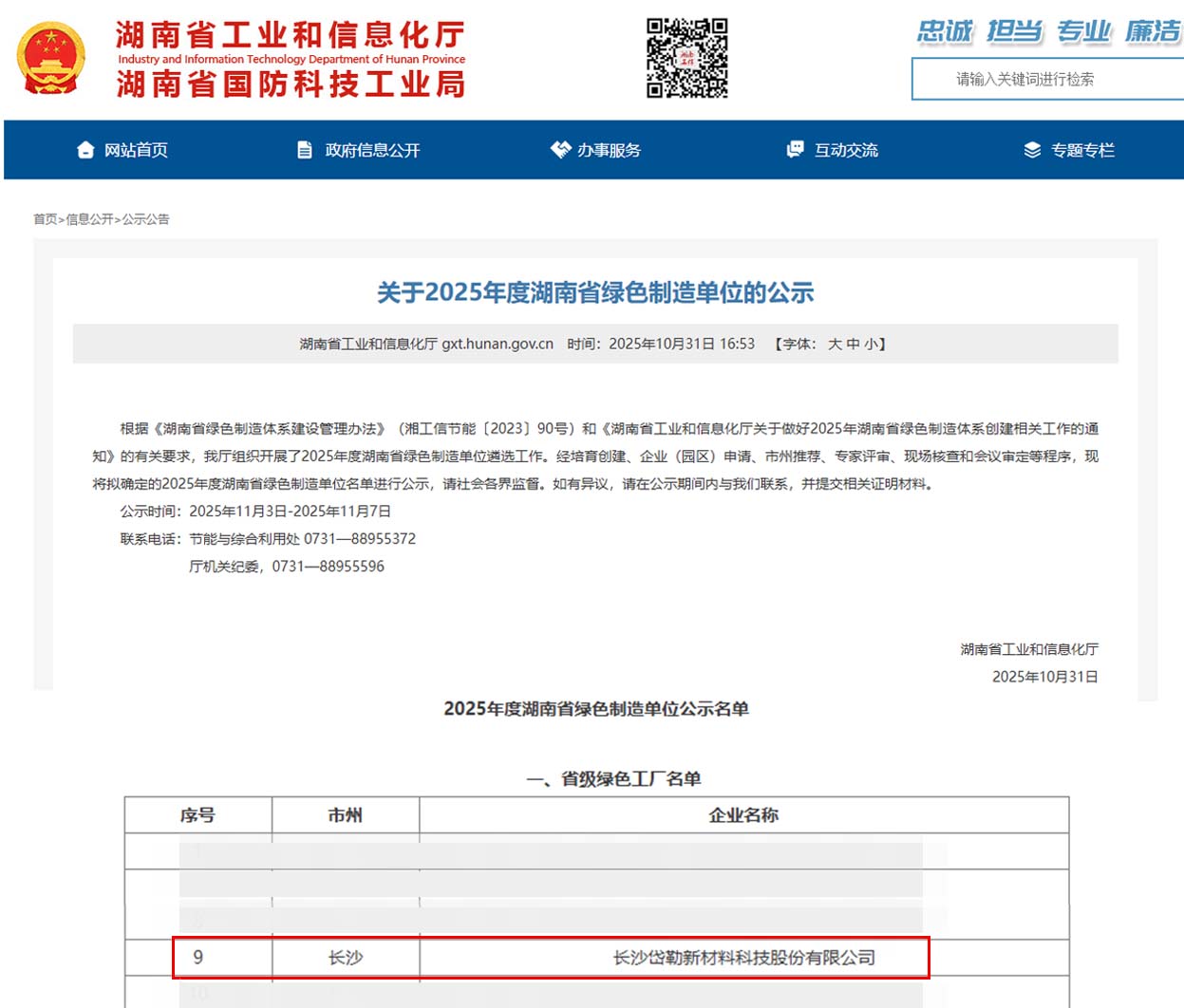 岱勒新材順利通過(guò)省級(jí)綠色工廠(chǎng)認(rèn)定,成功入選湖南省工業(yè)和信息化廳公示的2025年度湖南省綠色制造單位名單。這一榮譽(yù)是對(duì)公司···...