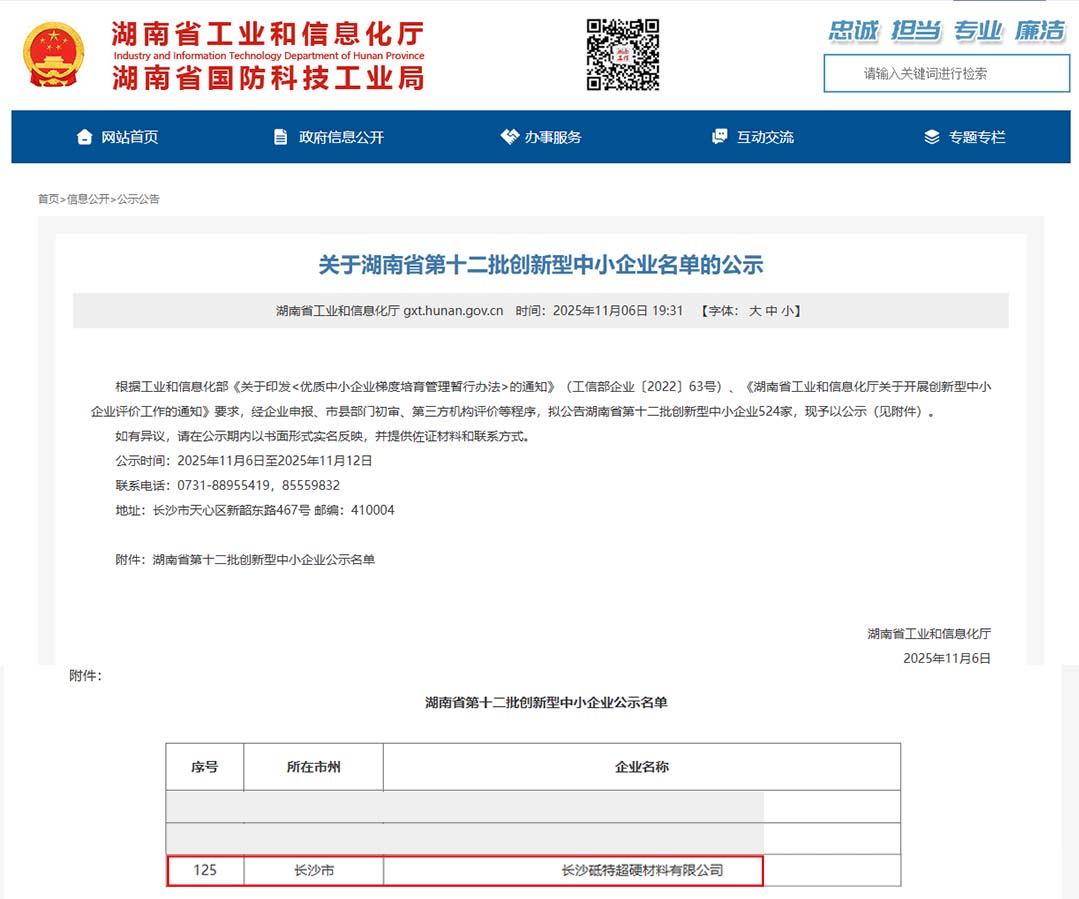 近日,湖南省工業(yè)和信息化廳組織公示“湖南省第十二批創(chuàng)新型中小企業(yè)”名單,長(zhǎng)沙砥特超硬材料有限公司成功入選,標(biāo)志著公司在科···...